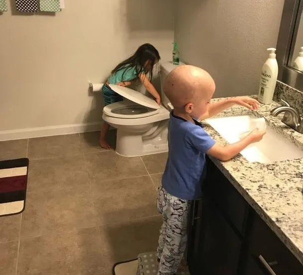 Una impactante imagen dio la vuelta al mundo esta semana, la cual muestra cómo una pequeña niña ayuda a su hermano en su lucha contra el cáncer.