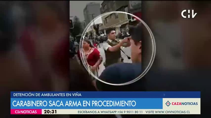 El hecho quedó registrado en las imágenes captadas por un cazanoticias, donde se ve a los uniformados forcejeando con los vendedores, que se habían instalado pese a la prohibición del municipio. La pelea fue subiendo de tono hasta que uno de los carabineros los apuntó con la pistola.