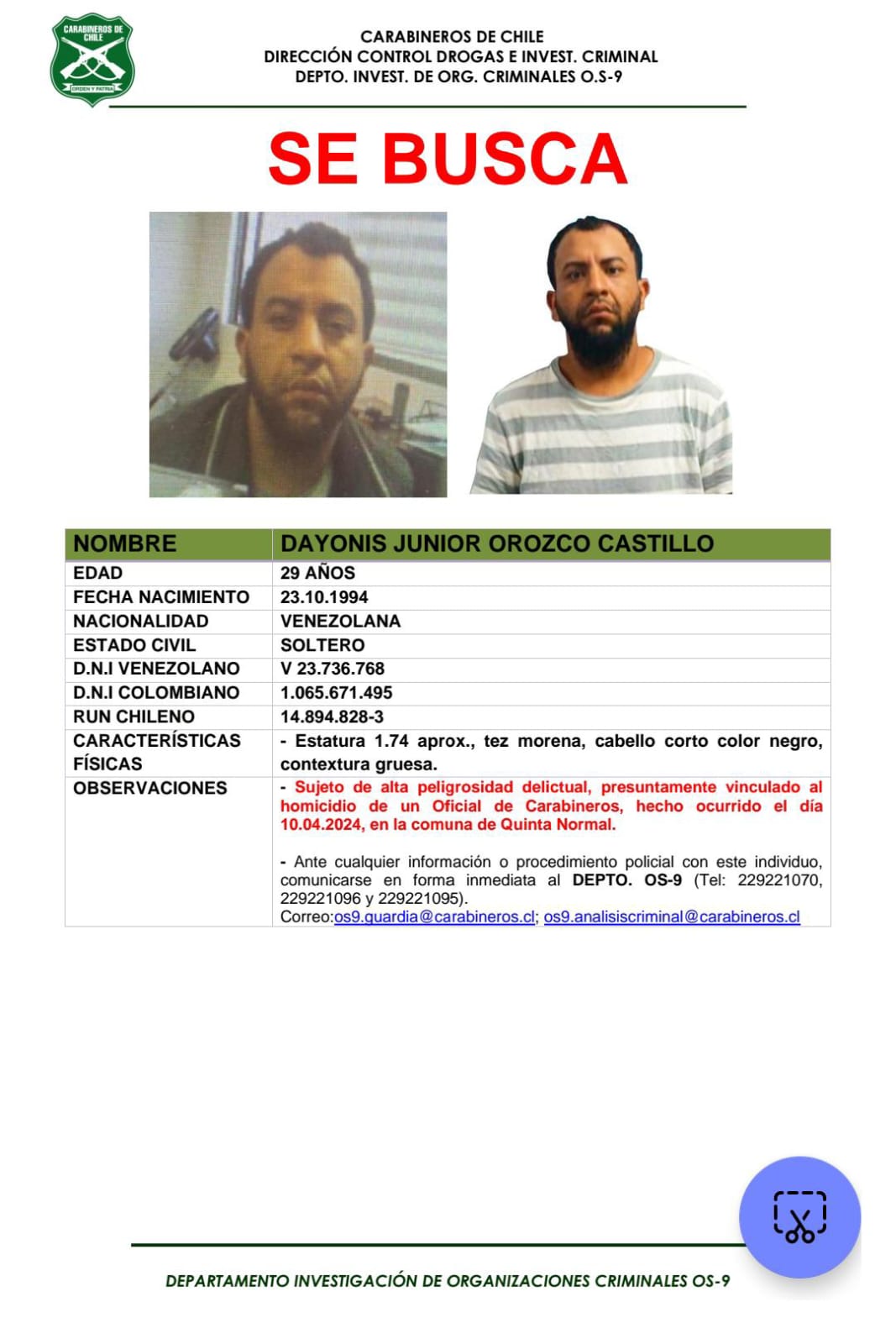 El Departamento de Investigación de Organizaciones Criminales reveló esta noche la identidad de Dayonis Junior Orozco Castillo, presunto implicado en el asesinato del carabinero. En caso de tener información, solicitaron contactar de inmediato a la policía.