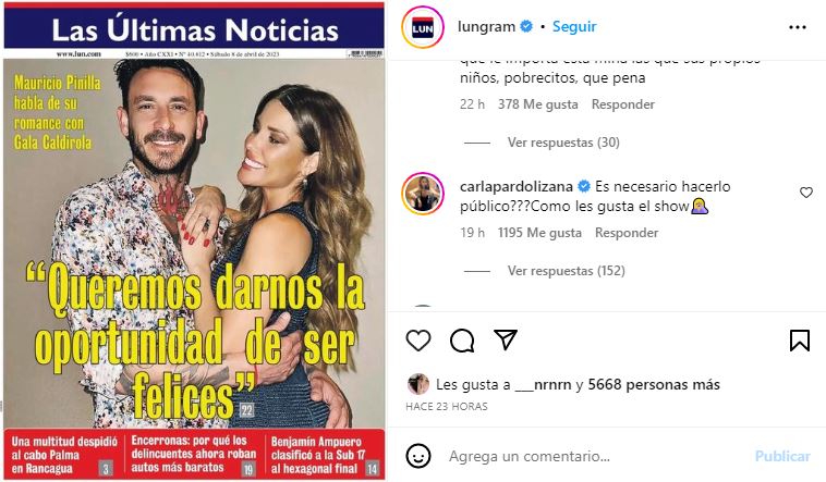 "El amor es libre y libremente te elijo", escribía Mauricio Pinilla hace un par de días para confirmar su relación amorosa con Gala Caldirola en redes sociales, noticia que sigue dando coletazos. La publicación hoy suma 184 mil likes, además de los cientos de comentarios y reacciones de usuarios se dejaron ver en redes sociales. El revuelo hizo que el diario Las Últimas Noticias publicara una portada con ambos en la que entregaban detalles sobre su vínculo, la que fue publicada en Instagram. Ante esto, Carla Pardo, la esposa de Claudio Bravo, publicó sin miedo un comentario sobre la noticia de ambas figuras televisivas. "¿Es necesario hacerlo público?", escribió Pardo en la fotografía. "Cómo les gusta el show", agregó con un emoji representando su frustración ante la situación.