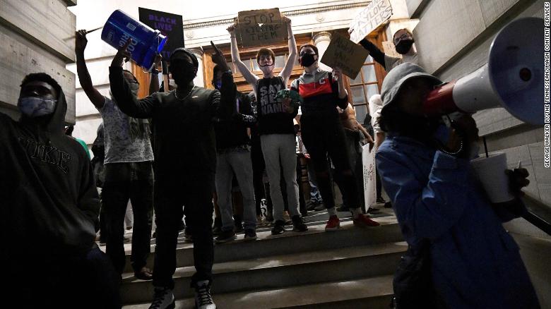 Personas se manifiestan en las puertas del Capitolio del Estado de Tennessee en Nashville.