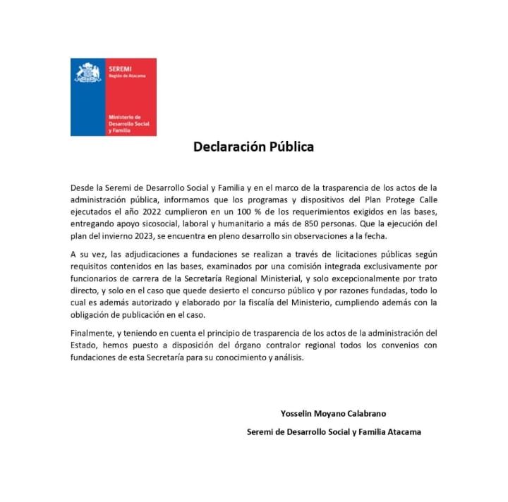 Tras los dichos del secretario de Estado, desde la Seremi de Desarrollo Social y Familia en Atacama, liderada porYosselin Moyano, emitieron un comunicado. "Los programas y dispositivos del Plan Protege Calle ejecutados el año 2022 cumplieron en un 100% de los requerimientos exigidos en las bases", señalaron en la declaración pública. Asimismo, aseguraron que "la ejecución del plan invierno 2023 se encuentra en pleno desarrollo sin observaciones a la fecha". En esa línea, indicaron que "las adjudicaciones a fundaciones se realizan a través de licitaciones públicas según requisitos contenidos en las bases, examinados por una comisión integrada exclusivamente por funcionarios de carrera de la Secretaría Regional Ministerial, y solo excepcionalmente por trato directo". Finalmente, señalaron que "hemos puesto a disposición del órgano contralor regional todos los convenios con fundaciones de esta Secretaría para su conocimiento y análisis".