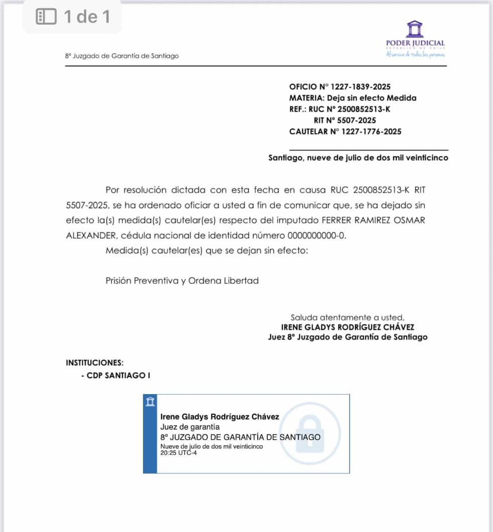 "Por resolución dictada con esta fecha... Se ha ordenado oficiar a usted a fin de comunicar que, se ha dejado sin efecto la medida cautelar respecto del imputado FERRER RAMÍREZ OSMAR ALEXANDER... Medida cautelar que se dejan sin efecto: Prisión preventiva y ordena libertad", se indica. Además, el documento estaba firmado por la jueza Irene Rodríguez Chávez.