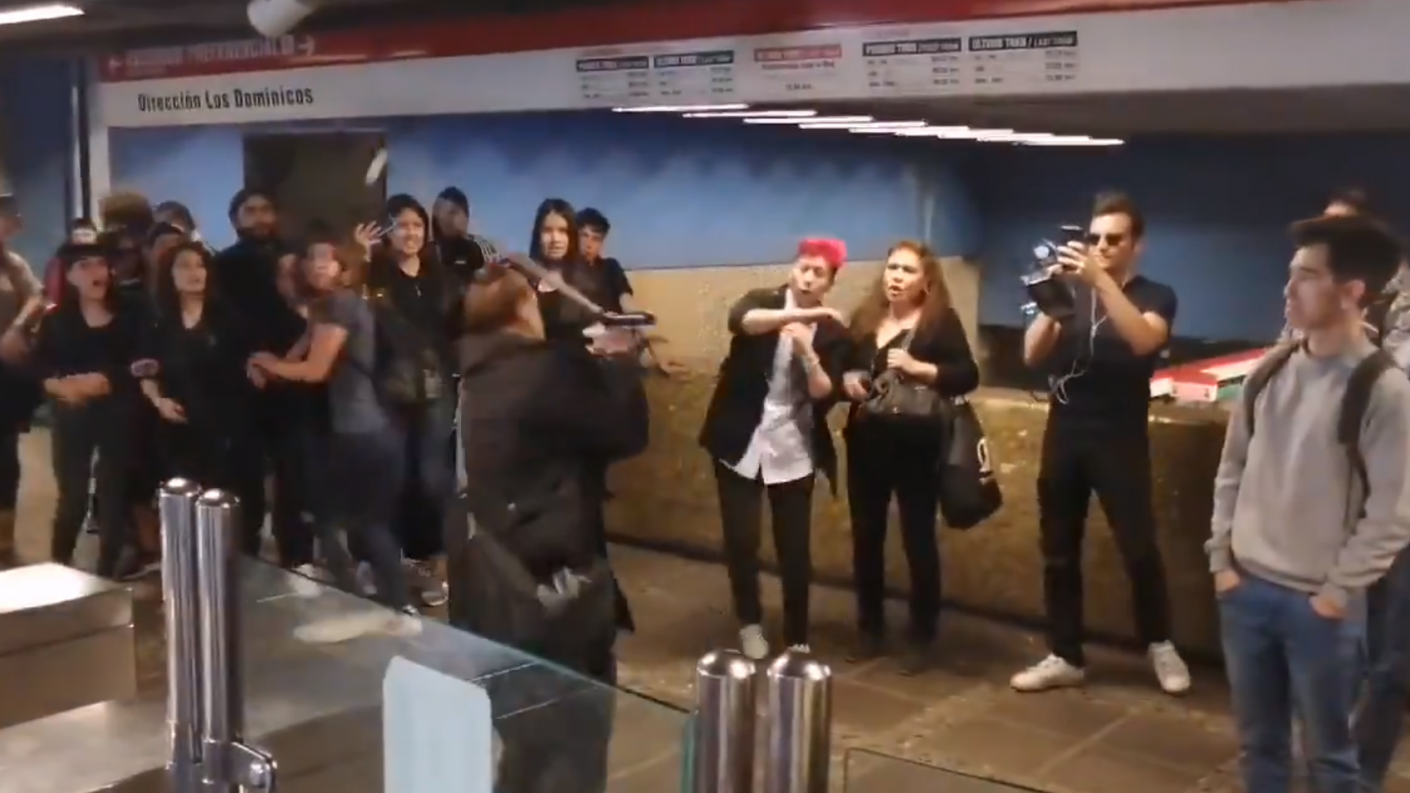 En metro Salvador mujer adulta ingresa y se enfrenta con estudiantes secundarios por #EvasionTodoElDia @adnradiochile