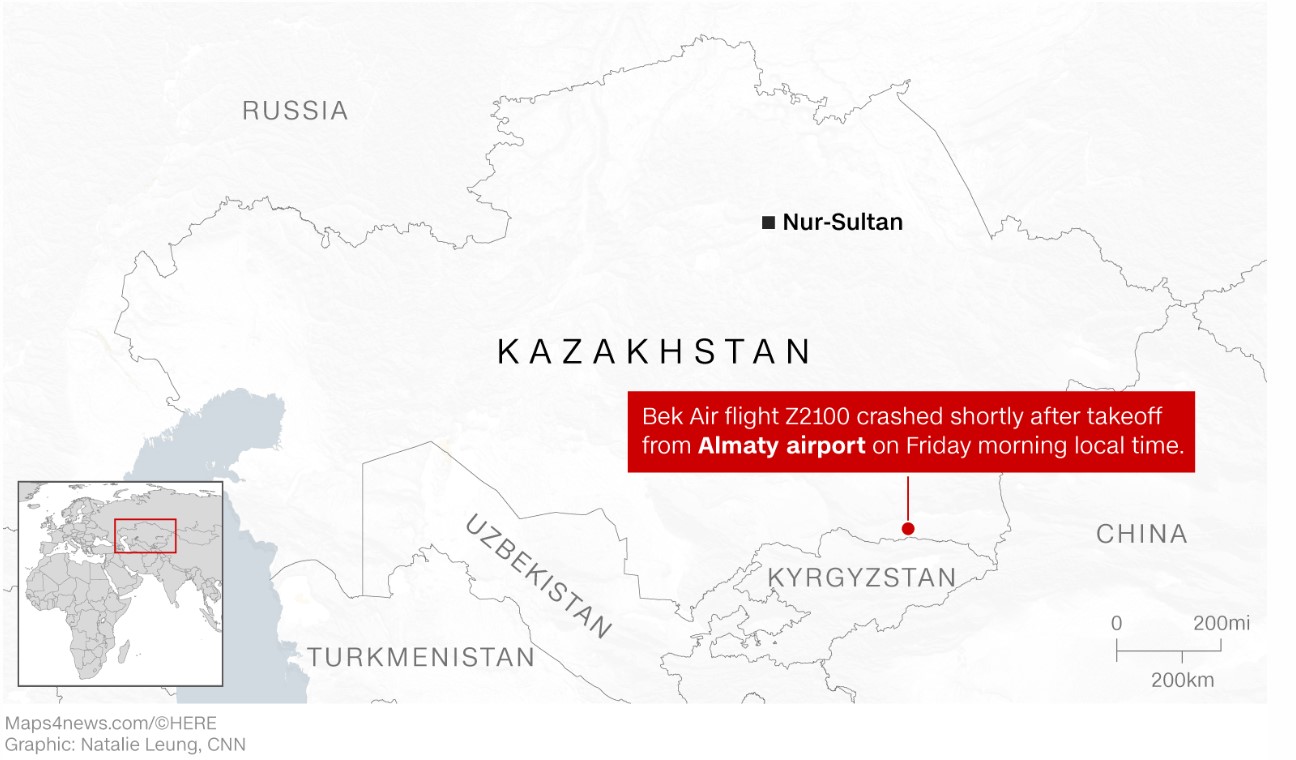 El vuelo Z2100, un avión Fokker 100, operaba en la línea Bek Air, basada en Kazajistán, y tenía planeado volar desde Almaty -la ciudad más grande del país- a la capital Nur-Sultan.