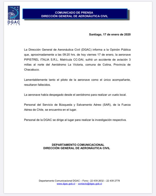 Minutos más tarde, esta información fue confirmada por la Municipalidad de Colina y la Dirección General de Aeronáutica Civil (DGAC).