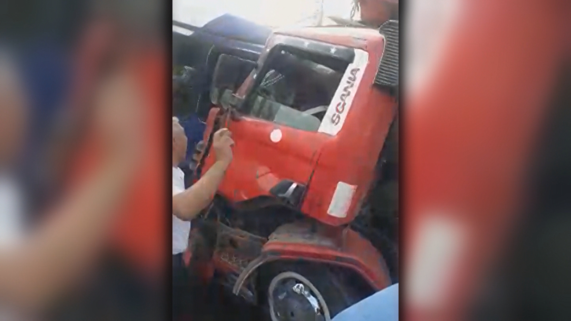 En un video que fue grabado sólo instantes después del choque, se ve cómo testigos intentaron agredir al conductor del vehículo de carga, lanzándole piedras hacia el interior.