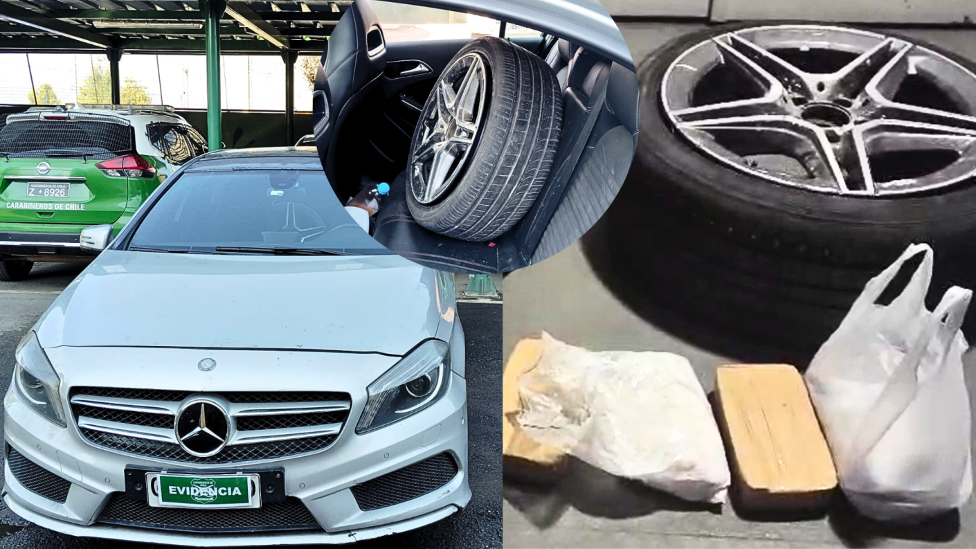 “Tras la detención y recuperación del vehículo se realizó una exhaustiva revisión de éste, encontrando en el asiento trasero dos llantas, las que al ser examinadas se detectó en una de ellas siete paquetes cubiertos con cinta adhesiva café, contenedora de droga pasta base de cocaína; y una bolsa nylon, también con este tipo de droga”, detalló.