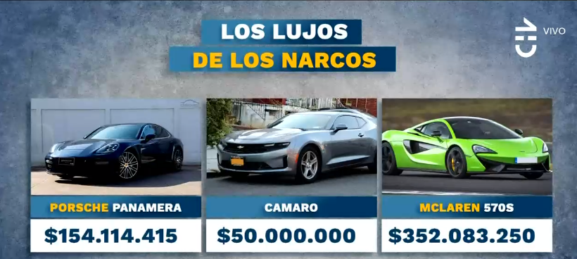 Porsche Panamera (150 millones de pesos) y un Chevrolet Camaro (50 millones de pesos).