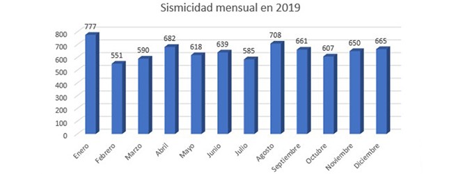 Al tomar la cifra total de los sismos localizados en 2019, es posible observar que ese año se procesaron en promedio 644 sismos mensuales o el equivalente a 21 sismos diarios.