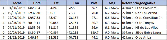 A ese sismo le siguió en magnitud uno "de 6,7 Mww, registrado el 19 de enero, 22 km al sur de La Serena, en la Región de Coquimbo, evento catalogado como intraplaca de profundidad intermedia, que se produce por una fractura al interior de la Placa de Nazca".