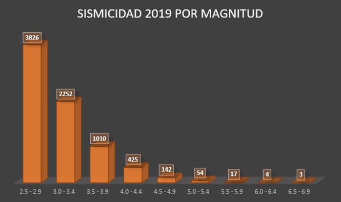 Al separar la sismicidad por magnitud, es posible apreciar que el año pasado, 645 sismos tuvieron una magnitud superior o igual a 4,0, casi 2 por día en promedio. Mientras que los sismos con magnitud superior o igual a 5,0 fueron 78 en total durante el año.