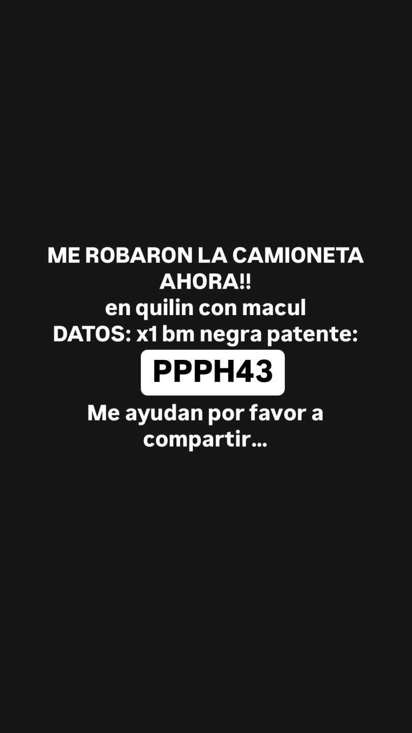 Finalmente, Jaime Valdés utilizó su cuenta de Instagram y pidió ayuda para encontrar el vehículo: "¡Me robaron la camioneta ahora! en Quilín con Macúl. Datos: X1 BMW negra, patente PPPH43. Me ayudan por favor a compartir", cerró.