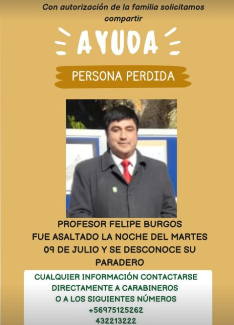 De acuerdo con un afiche publicado por el propio establecimiento educacional, al docente se le perdió el rastro luego de, presuntamente, haber sufrido un asalto.