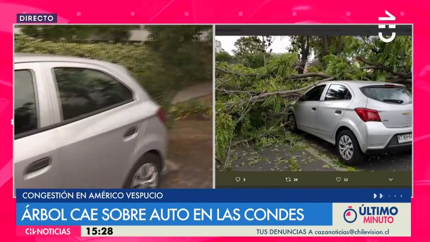 Un árbol cayó sobre un automóvil particular en Las Condes, generando una gran congestión en el sector de Latadía con Américo Vespucio en dirección al norte.