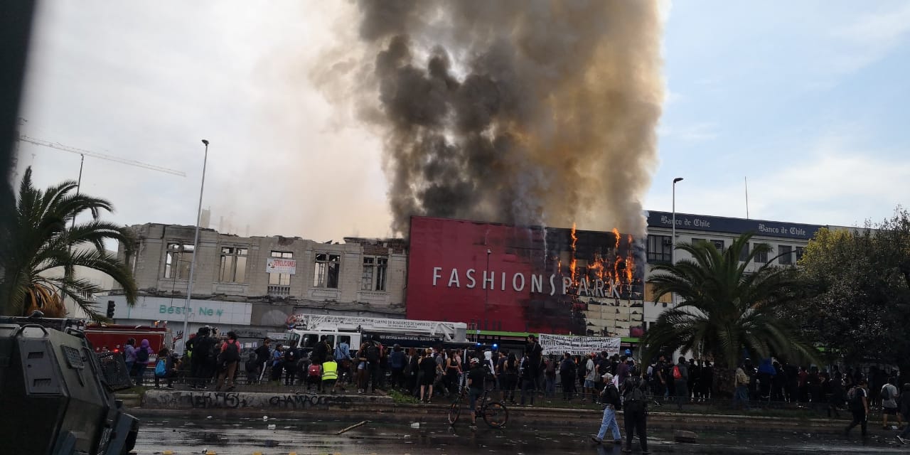 De acuerdo con el relato de Cazanoticias, una bomba molotov cayó en el techo de la tienda provocando un incendio a parte de la estructura ubicada en la Alameda con Matucana.