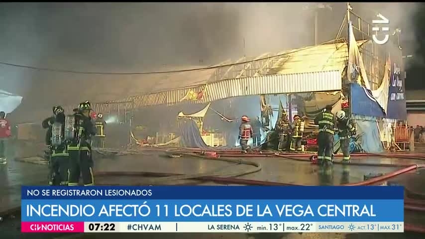 La madrugada de este miércoles 12 un violento incendio destruyó 11 locales comerciales ubicados en un galpón de la Vega Central, en la comuna de Recoleta.