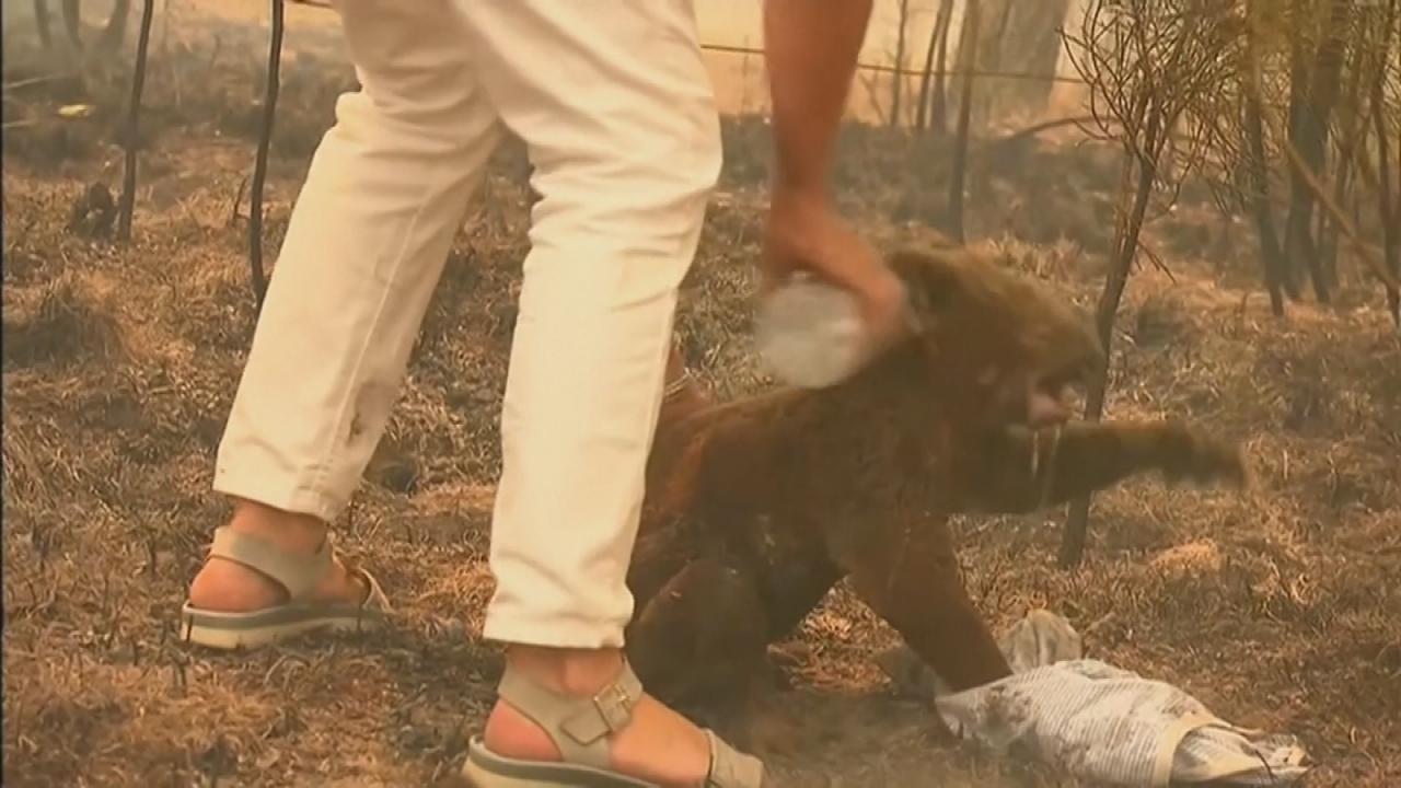 Imágenes captadas por medios locales, dieron cuenta de un koala que estaba intentando volver a su hogar, el cual estaba siendo consumido por el incendio. En otro de los registros, se le ve a una persona dándole agua.