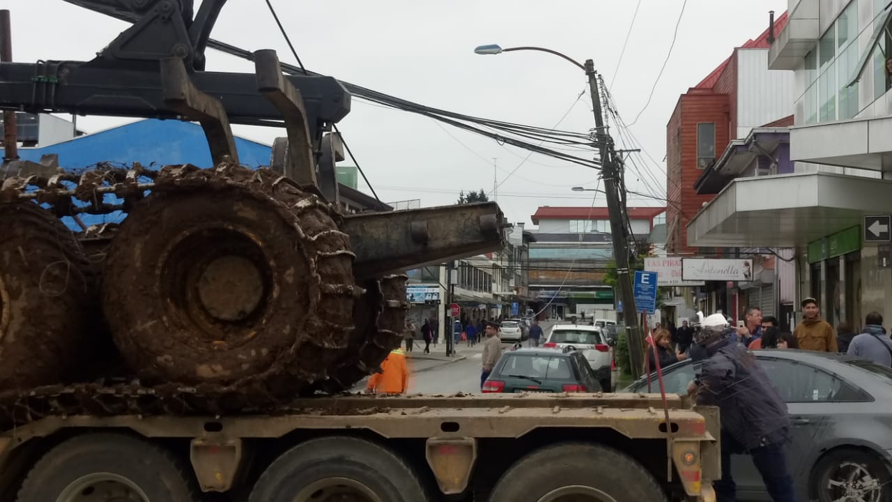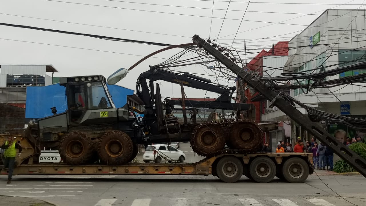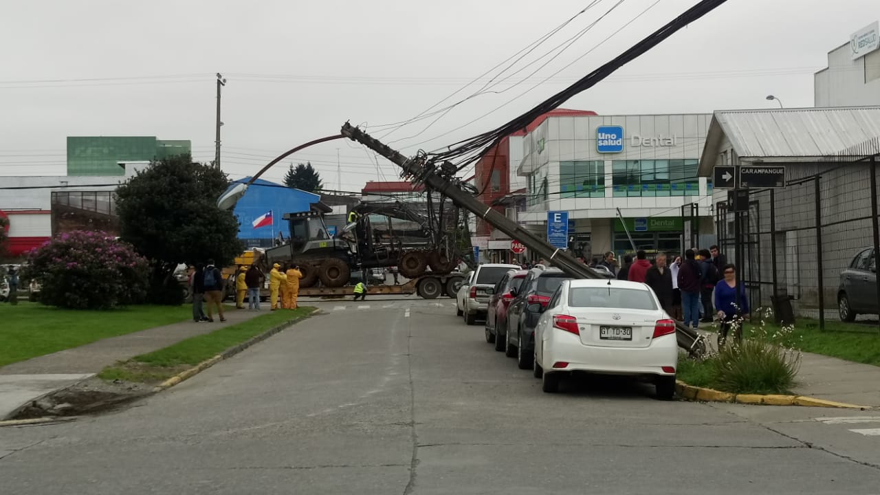 En horas de esta mañana, un camión cargado con maquinaria de construcción pesada derribó un total de 7 postes de tendido eléctrico en pleno centro de Valdivia.