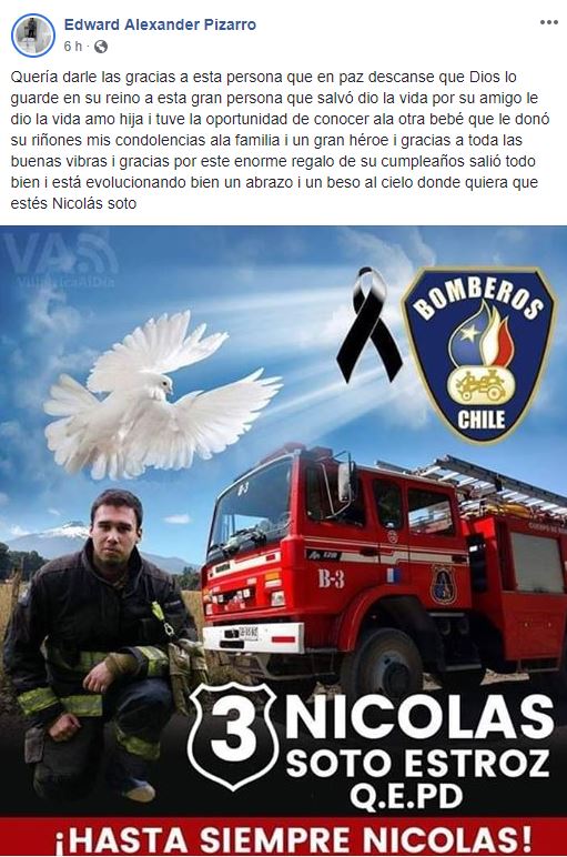 La vida de dos menores de edad ha sido salvada gracias a los órganos donados por el fallecido bombero Nicolás Soto, calificado como un héroe por las familias y cercanos de los beneficiarios.