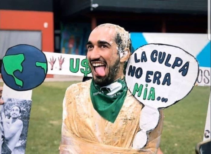 Lee también: Estudiante universitario se graduó burlándose de los femicidios y de “Un violador en tu camino”En las imágenes, que han sido viralizadas en redes sociales, se ve al hombre usando una bolsa en el cuerpo, como si estuviera amarrado, una pañoleta verde de la Campaña Nacional por el Derecho al Aborto Legal, Seguro y Gratuito, una soga al cuello y un cartel con la frase “la culpa no era mía”, en referencia a la manifestación contra la violencia de género, según indicó Clarín.