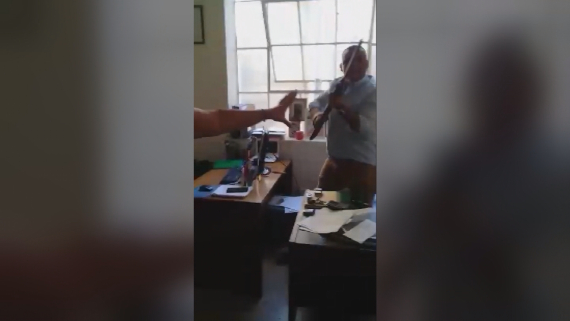 Incluso, en el video se ve cómo una mujer que se encontraba en la oficina tiene que afirmar a este enardecido hombre, para que no tomara la decisión de disparar.