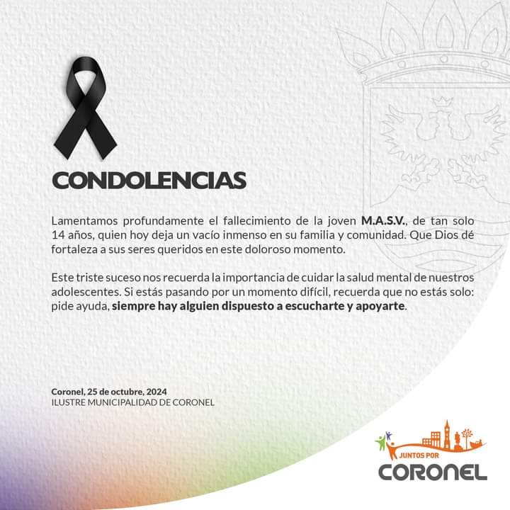 En tanto desde el municipio, lamentaron la muerte de la menor, afirmando que deja "un vacío en su familia y comunidad". "Este suceso nos recuerda la importancia de cuidar la salud mental de nuestros adolescentes", manifestaron mediante un comunicado.