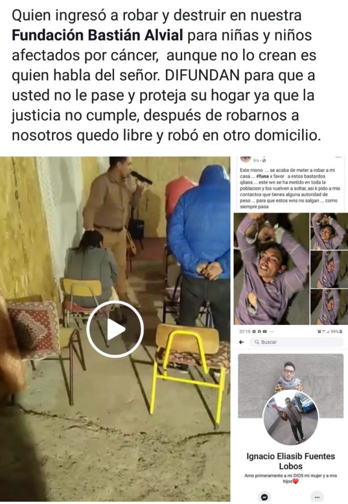 Lee también: Dueño de almacén repelió asalto enfrentándose a cuatro delincuentes solo con una sillaLa situación indignó a la afectada, debido a que anteriormente el delincuente ya había ingresado a este domicilio, pero no pudo ser captado. Sin embargo, esta vez pudo identificarlo y decidió publicar fotos de la detención ciudadana del sujeto en Facebook, material que fue visto después por Gabriel Alvial, creador de la Fundación Oncológica Infantil Bastián Alvial Huerta, a la que ingresó el antisocial .