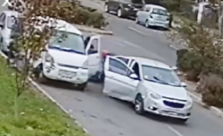En las imágenes otorgadas a CHV Noticias se ve cómo el conductor y el pioneta de un furgón fueron abordados por un grupo de delincuentes que los seguían en un auto, aparentemente sin patente.