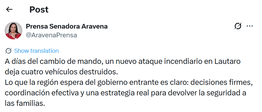 Al respecto, la senadora por La Araucanía, Carmen Gloria Aravena, señaló a través de su cuenta de X: "A días del cambio de mando, un nuevo ataque incendiario en Lautaro deja cuatro vehículos destruidos".