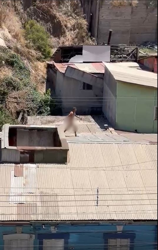 un hombre desnudo que se encontraba haciendo destrozos en el techo de un recinto en ese lugar.