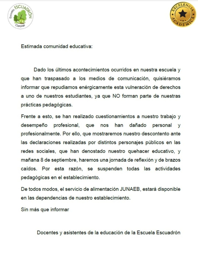 “Dado los últimos acontecimientos ocurridos en nuestra escuela que han traspasado a los medios de comunicación, quisiéramos informar que repudiamos enérgicamente esta vulneración de derechos a uno de nuestros estudiantes (…) Haremos una jornada de reflexión y de brazos caídos”, indicaron en el comunicado.