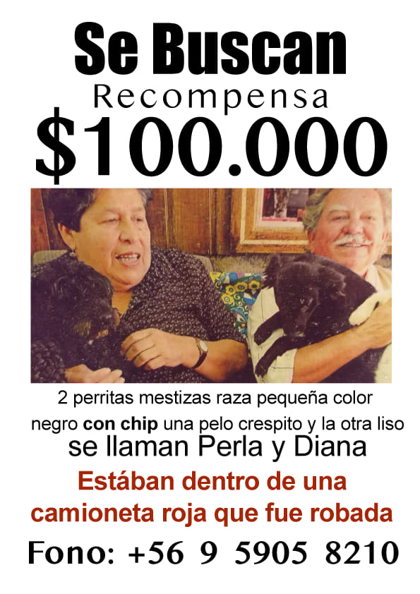 “Son la vida de nosotros, no tenemos hijos”, relató a CHV Noticias Aquiles Jiménez, quien a sus 80 años sufre por no saber qué pasó con sus "regalonas". "La camioneta no importa, pero la pérdida de las perras es la desgracia más grande que nos ha pasado desde que estamos casados”, dijo. Ahora ofrecen una recompensa por encontrarlas.