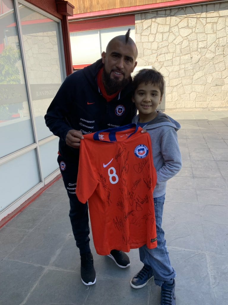 Javier Miranda agradeció la oportunidad que le dio el futbolista Arturo Vidal, quien, antes de embarcarse al desafío de la Copa América en Brasil, le obsequió una camiseta autografiada por él y varios de sus compañeros. La intención de este padre es subastar o rifar la camiseta para, de esta forma, obtener fondos cuya finalidad primaria es realizarle una necesaria mantención a la cama de su hijo.