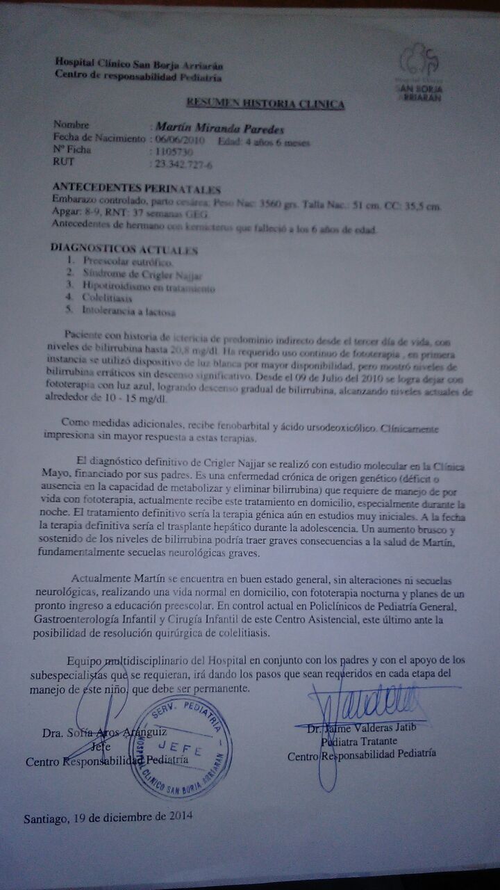 Lee también: Niño con síndrome de Down padece leucemia y requiere $100 millones para trasplante de médulaEllo porque el niño padece del Síndrome de Crigler-Najjar (SCN), extraña enfermedad que, de acuerdo al médico tratante, solamente estaría presente en tres casos en Chile.