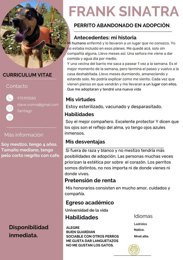 Frank Sinatra está en adopción. Y no, no es el cantante. Es un perrito mestizo de 4 años que vive solo en una casa desde marzo pasado.