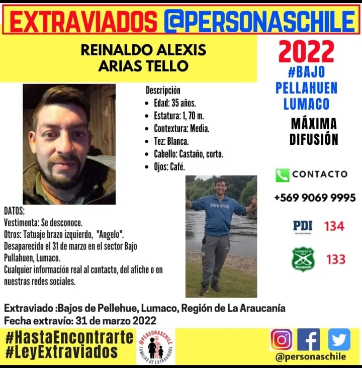 El pasado 31 de marzo fue el último día que se tuvo rastro de Reinaldo Alexis Arias Tello, hombre de 35 años oriundo de Buin, quien se trasladó hace ocho meses a la comuna de Lumaco, en la Región de La Araucanía, para trabajar en la industria del carbón en el sector de Bajo Pellahuén.