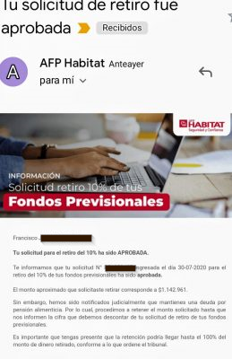 El lunes, Francisco recibió un correo electrónico de AFP Habitat, donde le señalaban que su solicitud de retiro había sido aprobada, pero que al mantener una deuda por pensión alimenticia, el monto solicitado será retenido. "Yo encuentro insólito que los tribunales de familia se equivoquen de tal manera", comenta.