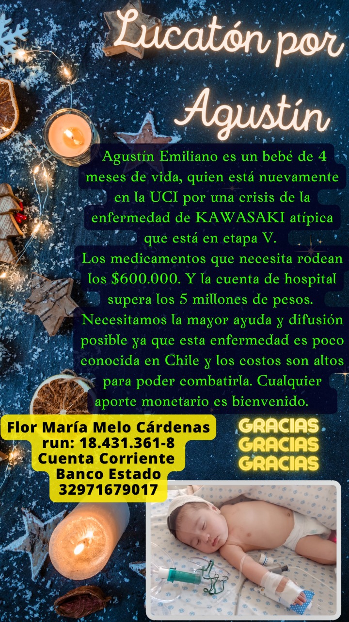 Flor Melo Cárdenas, madre de Agustín, un lactante de cinco meses que padece la enfermedad de Kawasaki (EK) en su etapa más alta, pide ayuda para costear el tratamiento de su hijo. Su rara condición compromete los vasos sanguíneos y le provoca aneurismas gigantes en las arterias coronarias, aumentando el riesgo de infartos al corazón.