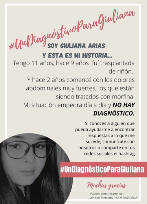 Tiene 11 años y ha pasado gran parte de su corta vida en hospitales y rodeada de profesionales médicos. Hablamos de Giuliana Arias, quien primero tuvo que luchar por tratar de conseguir un trasplante de riñón y ahora intenta tener un diagnóstico claro por un raro dolor abdominal que no le permite llevar una vida normal.