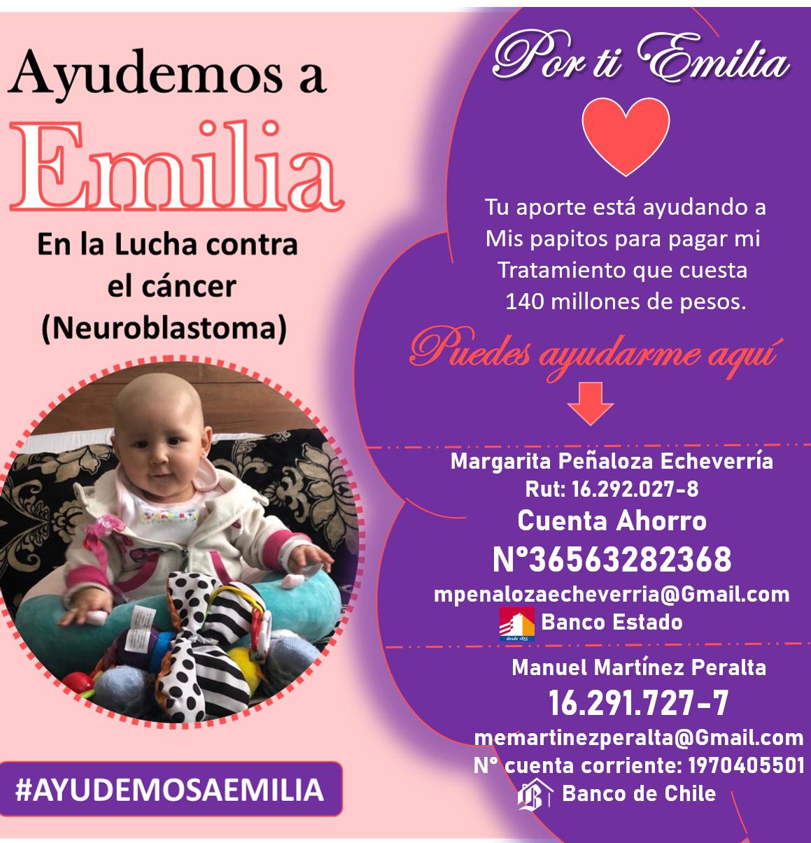 Cuando apenas tenía tres meses de vida, a Emilia le diagnosticaron neuroblastoma, un tumor en las glándulas suprarrenales que hizo metástasis en su hígado. La quimioterapia no tuvo el efecto esperado, así es que los médicos indicaron la utilización de un costoso medicamento que sólo se comercializa en el extranjero.