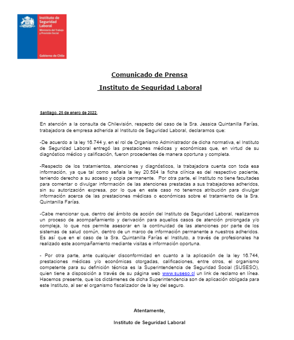 En un comunicado de prensa entregado a Chilevisión Noticias, el Instituto de Seguridad Laboral se refirió a lo sucedido con Jessica Farias, señalando que: “ISL entregó las prestaciones médicas y económicas que, en virtud de su diagnóstico médico y calificación, fueron procedentes de manera oportuna y completa”.