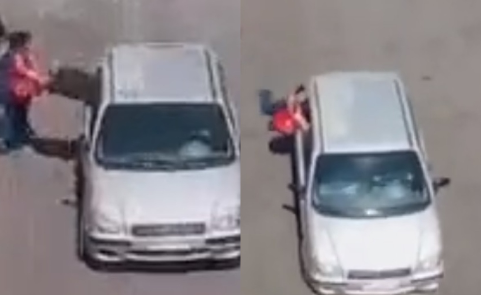 un hombre asaltar a una mujer desde la ventana de copiloto de un auto en movimiento.