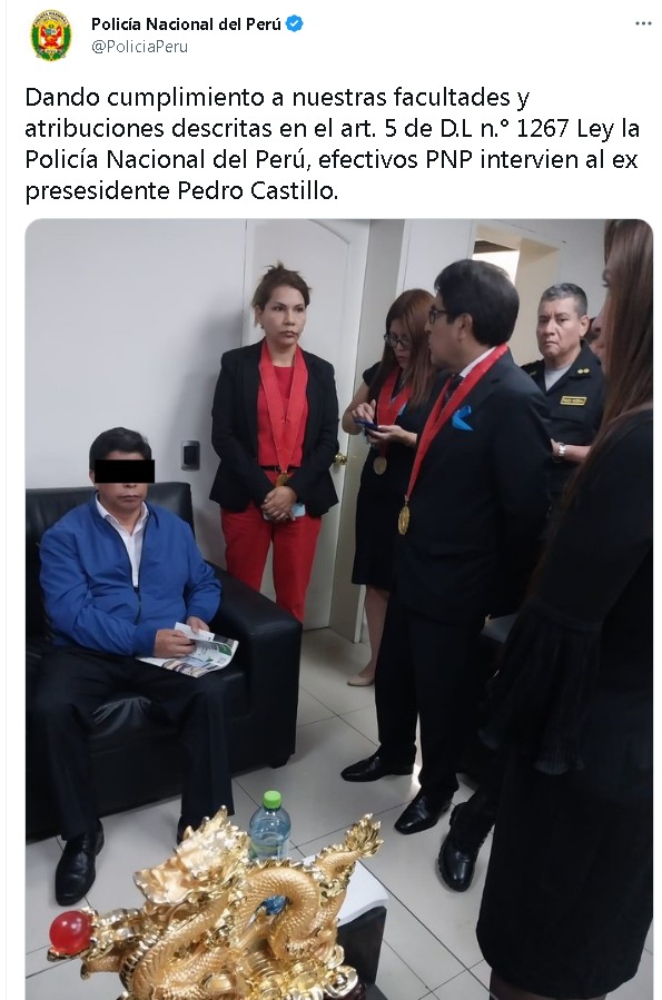 Horas más tarde, Castillo fue arrestado por las autoridades por presuntamente "violar la Constitución". En ese contexto, se reveló la primera imagen del otrora jefe de Estado detenido.