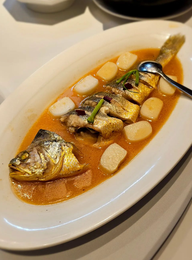En uno se ve una especie de sopa de pescado cortado en trozos incluyendo la cabeza y en otro la cabeza de un pollo como parte de la decoración. Kel Calderón / Instagram
