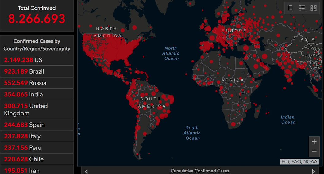 El listado es liderado por Estados Unidos, que cuenta con 2.217.714 contagiados, seguido de Brasil con 934.769, Rusia con 553.301, India con 359.506 y Reino Unido con 299.251.