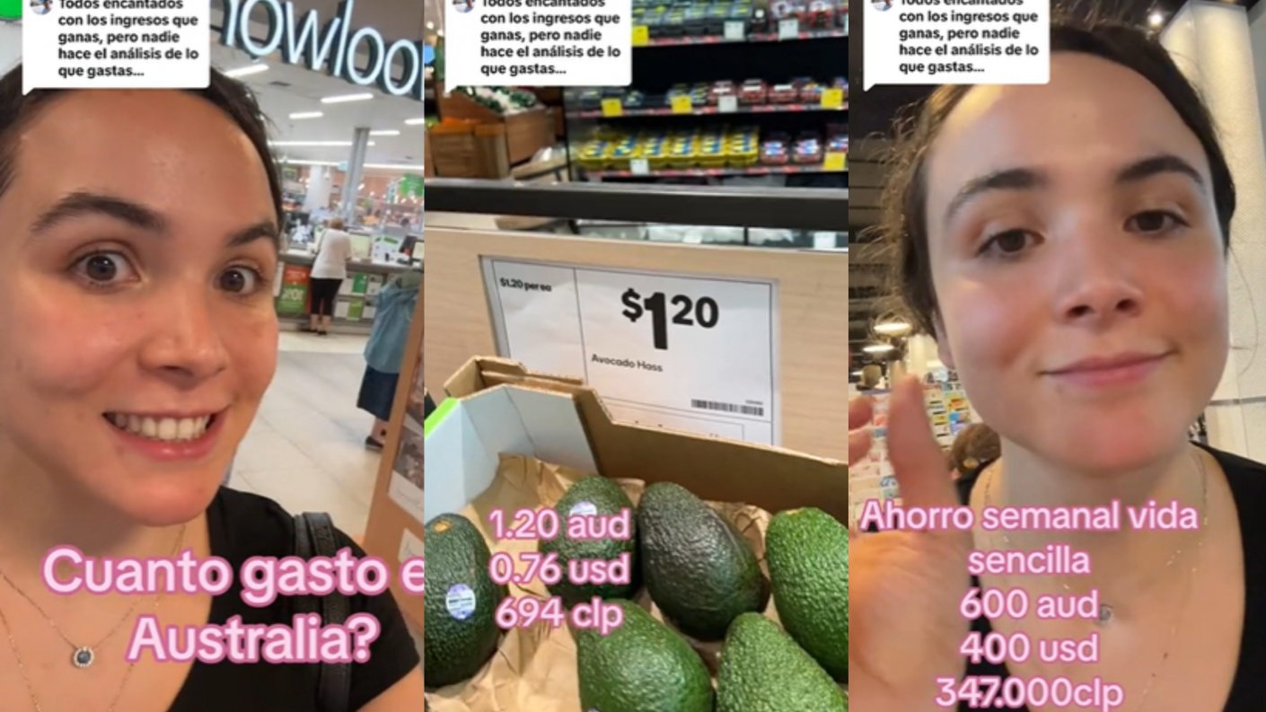 Pero ahora hubo un nuevo video que llamó la atención de los chilenos y chilenas, dando a conocer cuáles son los gastos que debe afrontar con este sueldo, respondiendo a las dudas sobre si vale la pena vivir en ese país desde el punto de vista económico. Concretamente, la joven mostró una compra en supermercado y que correspondió a alimentos que adquiere, generalmente, para una semana. Dentro de las comidas que echó a su carro, hubo por ejemplo una malla de paltas por 4 dólares australianos (2.300 pesos chilenos); bolsa de tomates por 2,9 dólares australianos (1.600 pesos chilenos); un kilo de arroz por 1,8 dólares australianos (mil pesos chilenos), entre varios otros. En total, el listado de compras incluyó 9 productos y todo por un costo de 15 mil pesos chilenos, aproximadamente. "Eso es lo que gastaría en cinco días de comer", explicó, añadiendo al cálculo que en remuneración "uno en general recibe como mil dólares australianos (578 pesos chilenos semanales)". "Eso es como el promedio de sueldo acá en Australia si es que haces las 40 horas. Contando el impuesto que es del 19% que va, por ejemplo, a la salud que es casi gratuita. Yo casi nunca pago teniendo la nacionalidad australiana", continuó.