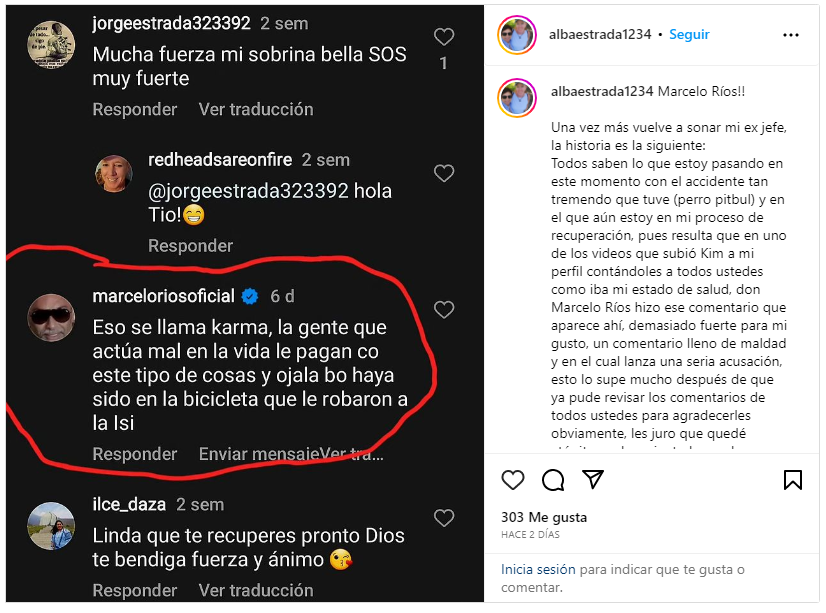 El mensaje que dejó Chino Ríos a su ex niñera, Alba Estrada. Fuente: Instagram.