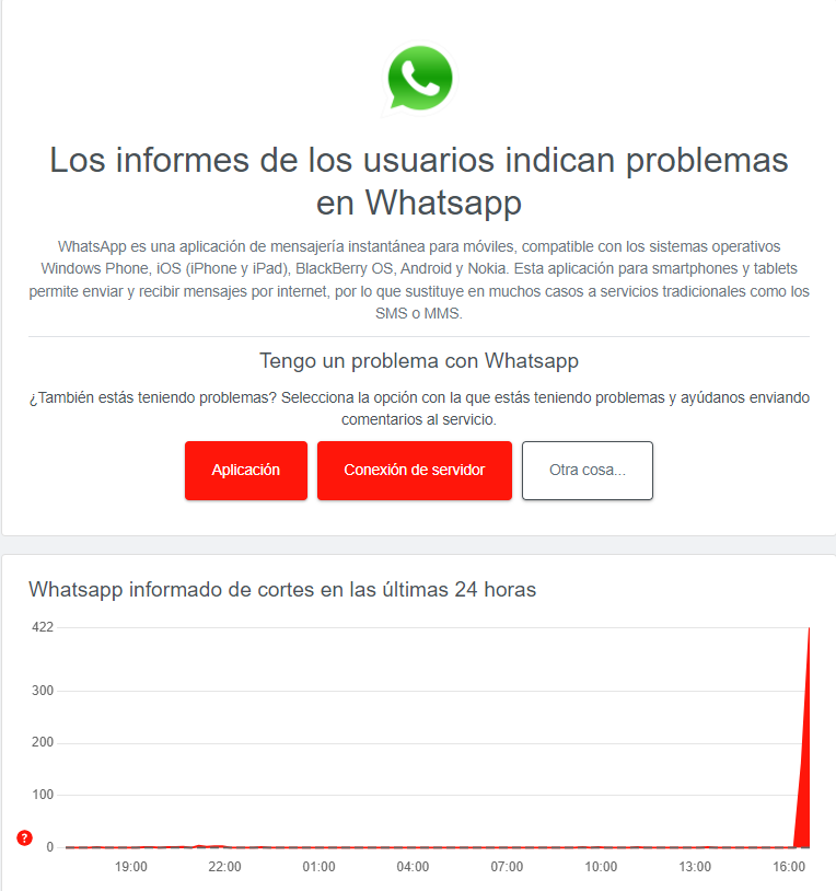 Además, el portal Down Detector, plataforma dedicada a informar en tiempo real sobre el estado de diferentes sitio web y redes sociales, ya reportó que WhatsApp presenta una falla.