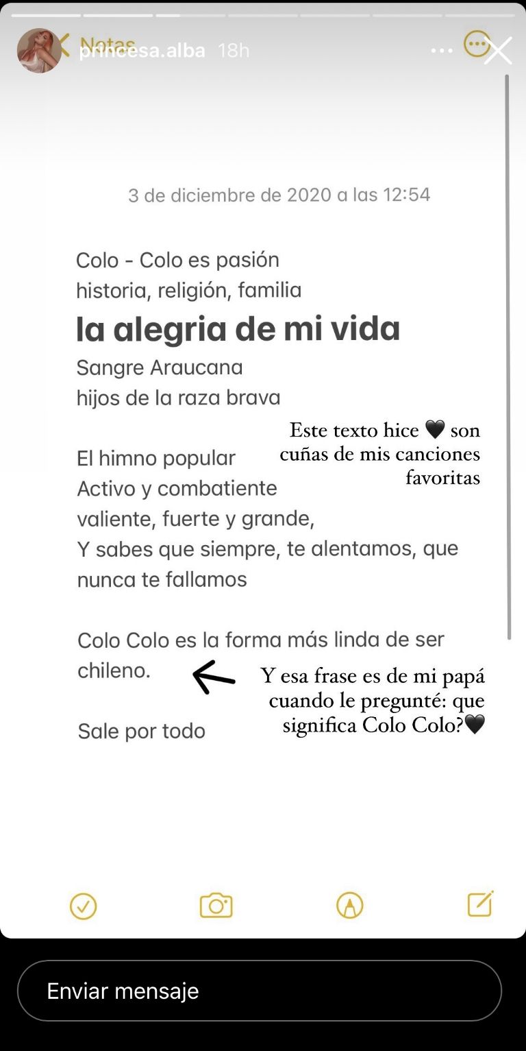 Pero que llamó particularmente la atención fue "Colo Colo es la forma más linda de ser chileno", frase que según explicó la misma artista "es de mi papá cuando le pregunté 'qué significa Colo Colo'".